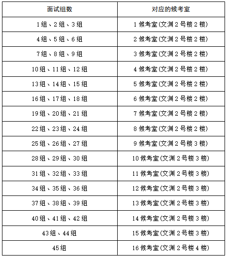 請考生在進(jìn)入候考室之前務(wù)必仔細(xì)閱讀面試日程表和面試組數(shù)與候考室對應(yīng)關(guān)系表,認(rèn)準(zhǔn)本人對應(yīng)的面試組數(shù)以及該組所對應(yīng)的候考室,準(zhǔn)確、準(zhǔn)時在本人對應(yīng)的候考室候考。由于每間候考室同時封閉多組考生,考生進(jìn)入候考室請在本組固定的候考區(qū)域候考(每組考生候考區(qū)域有座簽標(biāo)注),不得與其他組候考考生混坐。