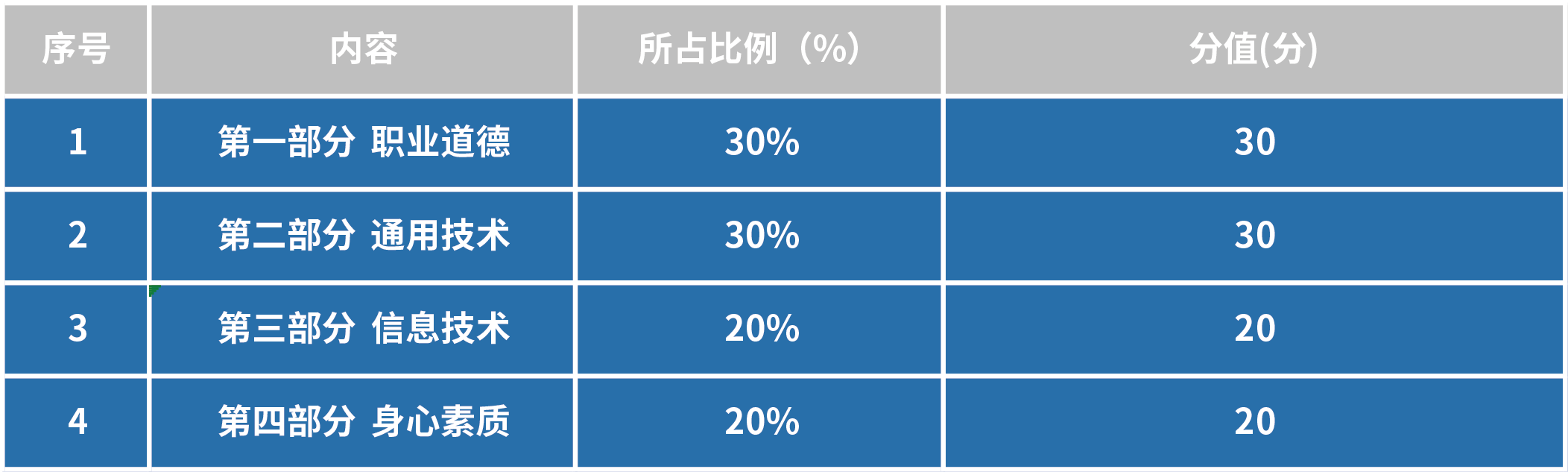 占50分,職業(yè)適應(yīng)性測試占100分。職業(yè)適應(yīng)性測試為選拔性測試,主要考查考生從事生產(chǎn)、建設(shè)、服務(wù)、管理等一線工作所必備的基本職業(yè)素質(zhì)或技能。