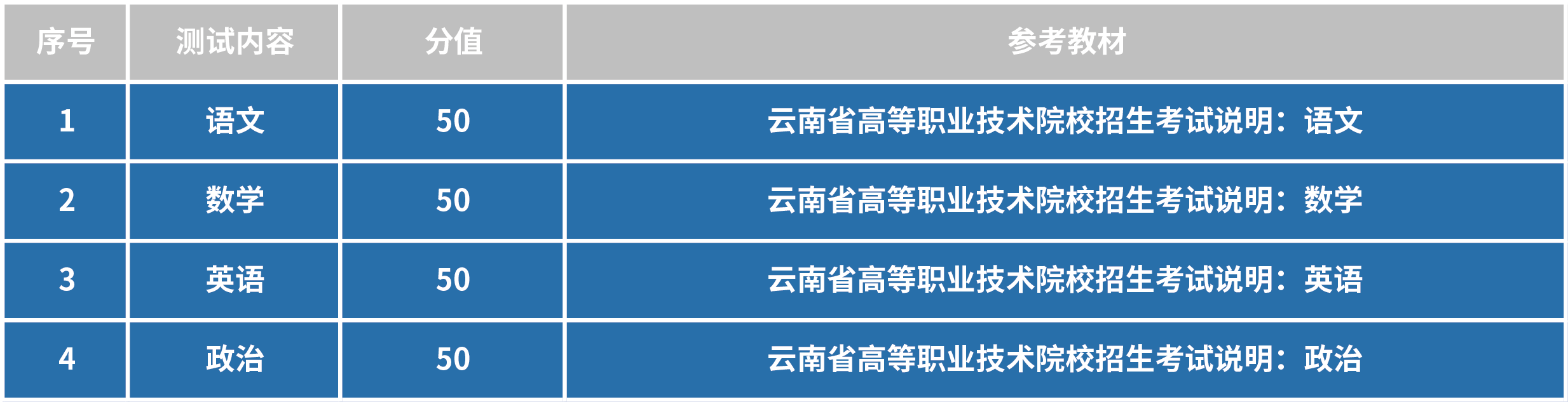 本次考試公共基礎(chǔ)課測試內(nèi)容為語文、數(shù)學(xué)、英語、政治等四個部分,每個部分的分值為50分。本次考試不指定考試用書,只推薦參考教材(見下表)。