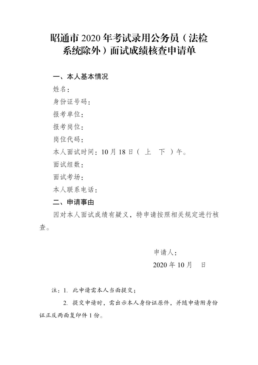 2.昭通市2020年考試錄用公務(wù)員(法檢系統(tǒng)除外)面試成績核查申請單