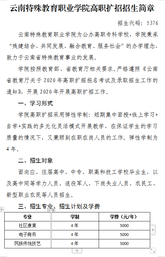 2020年云南特殊教育職業(yè)學(xué)院高職擴(kuò)招招生簡章