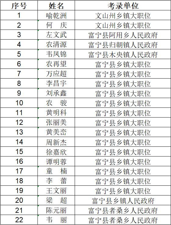 2020年考試錄用公務員經(jīng)體檢合格由富寧縣負責考察的考生,具體人員名單及考察單位分配如下: