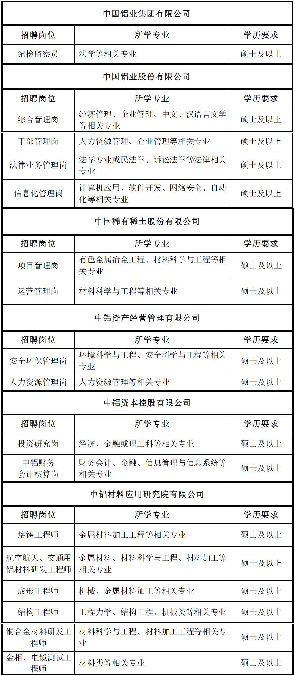 中國(guó)鋁業(yè)集團(tuán)有限公司2021年應(yīng)屆高校畢業(yè)生招聘公告