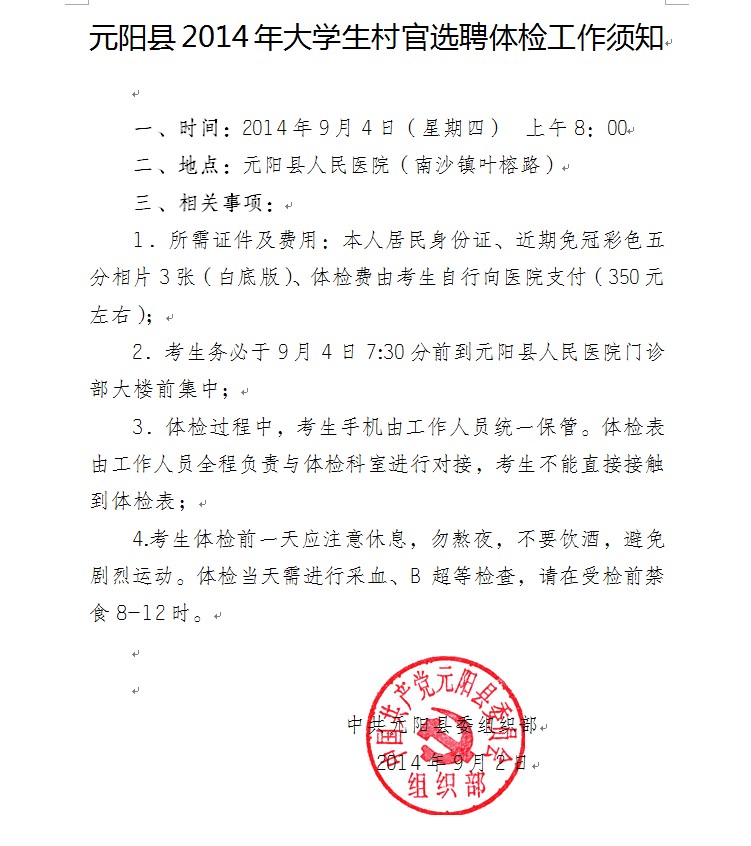 紅河州元陽(yáng)縣2014年大學(xué)生村官選聘體檢工作須知