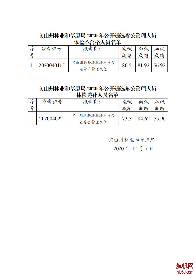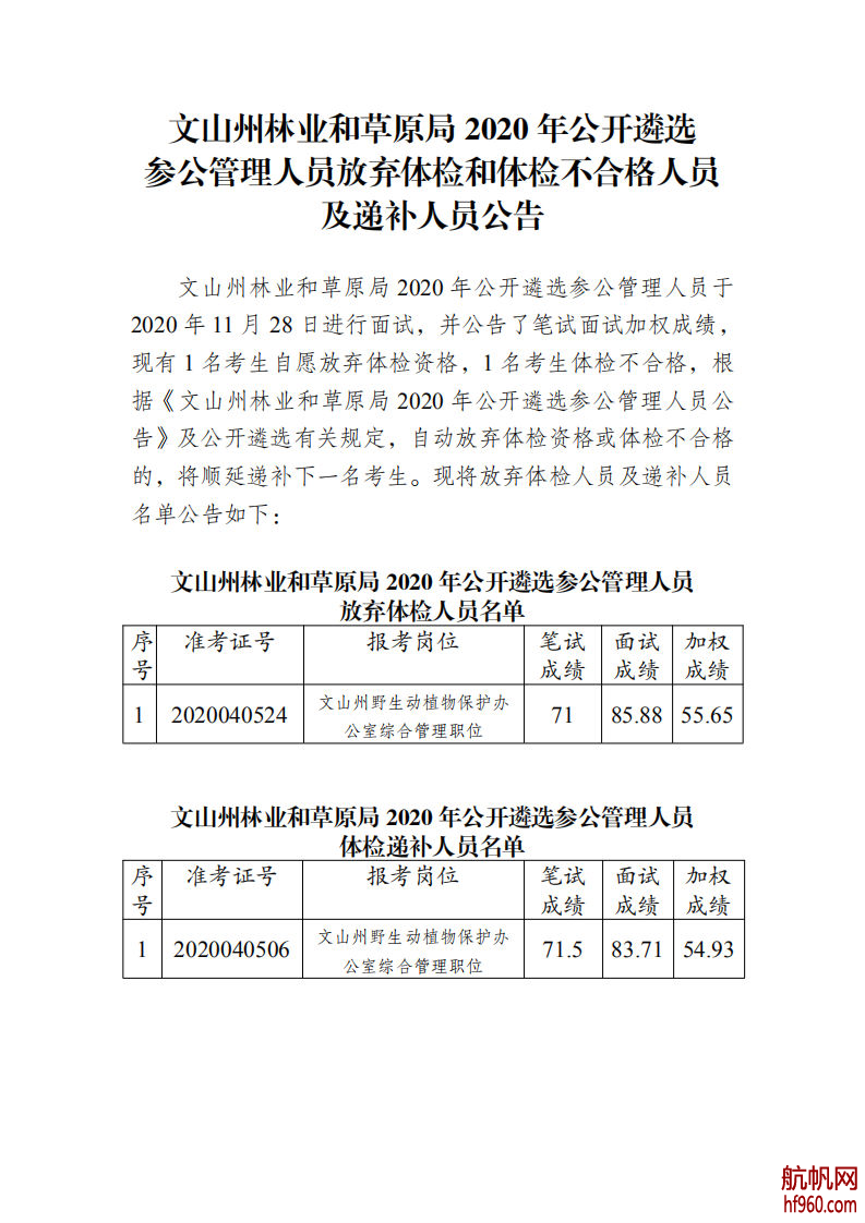文山州林業(yè)和草原局2020年公開遴選參公 管理人員放棄體檢和體檢不合格人員及遞補(bǔ)人員公告