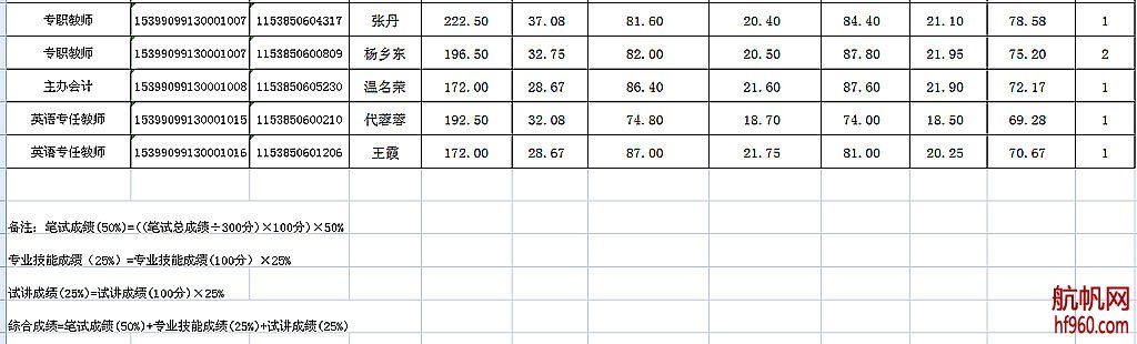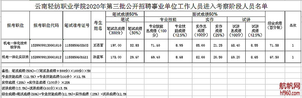 根據(jù)面試人員綜合成績(綜合成績=專業(yè)技能成績×50%+試講面試成績×50% 或 綜合成績=專業(yè)技能成績×25%+試講面試成績×25%+實(shí)作成績×50%),按從高到低順序及崗位擬招聘人數(shù)等額確定進(jìn)入考察階段的人員?,F(xiàn)將情況說明及公示如下: