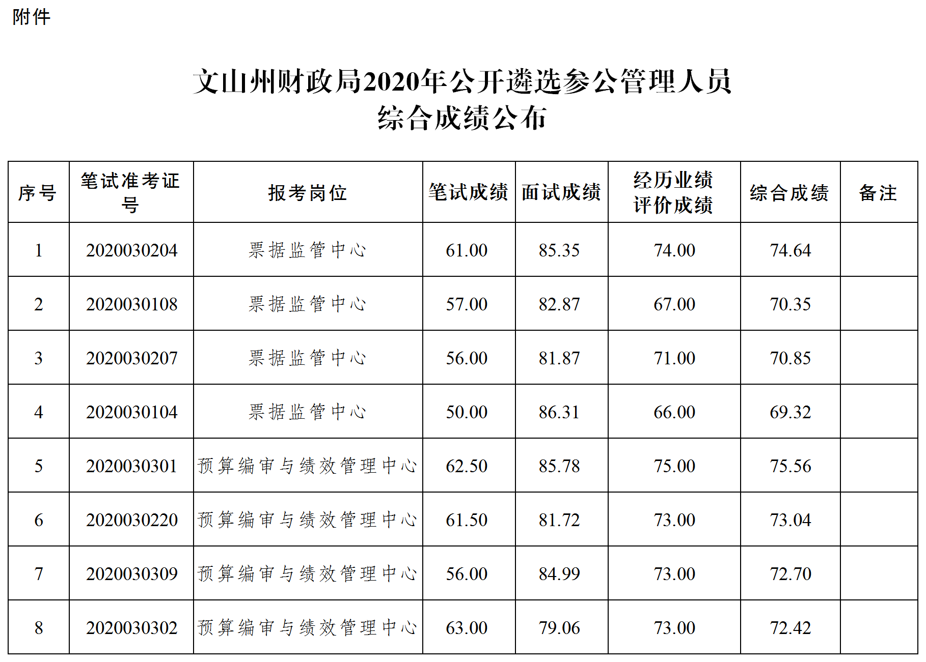 根據(jù)《文山州財(cái)政局2020年公開遴選參公管理人員公告》要求,經(jīng)過筆試、面試、體檢、經(jīng)歷業(yè)績評價(jià)和組織考察等環(huán)節(jié),現(xiàn)將進(jìn)入最后一個環(huán)節(jié)的考生綜合成績進(jìn)行公布(詳見附件)。