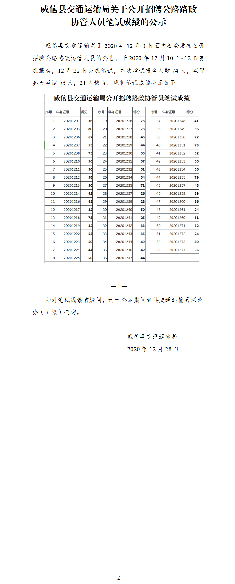 威信縣交通運輸局關于公開招聘公路路政協(xié)管人員筆試成績的公示