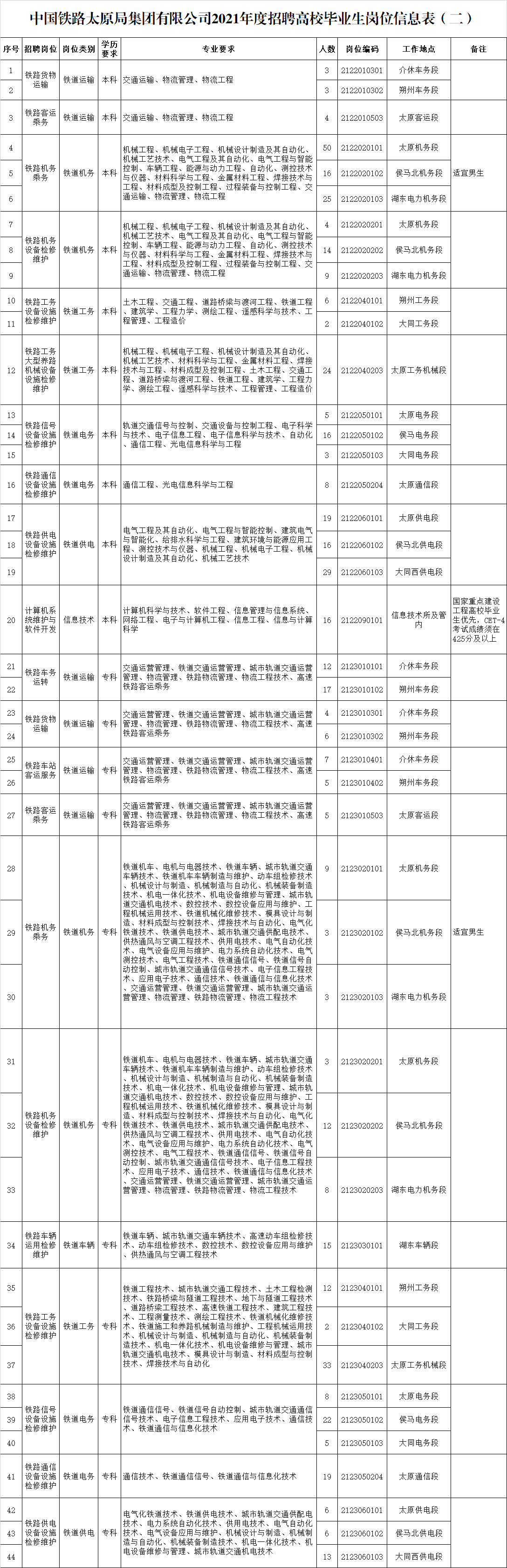 招聘崗位、學(xué)歷、專業(yè)、人數(shù)和工作地點(diǎn)等內(nèi)容詳見《中國(guó)鐵路太原局集團(tuán)有限公司2021年度招聘高校畢業(yè)生崗位信息表(二)》。