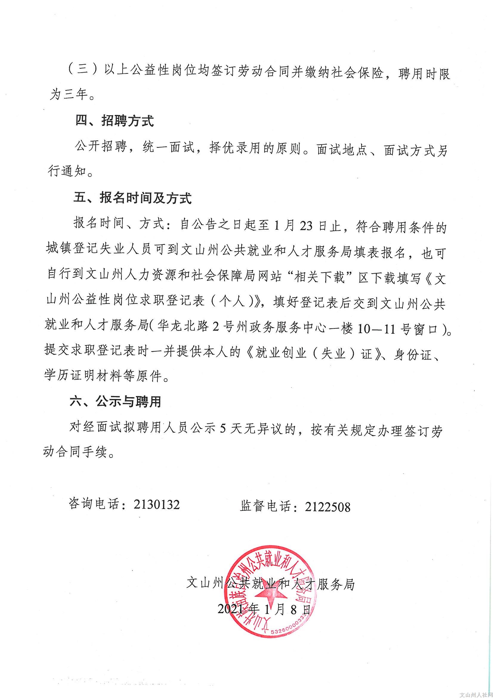 關(guān)鍵信息 招聘人數(shù):2人 報(bào)名時(shí)間:截止1月23日 文山州綠色食品發(fā)展中心、文山州動(dòng)物衛(wèi)生監(jiān)督所 公開招聘公益性崗位工作人員的通告(2021第一期)