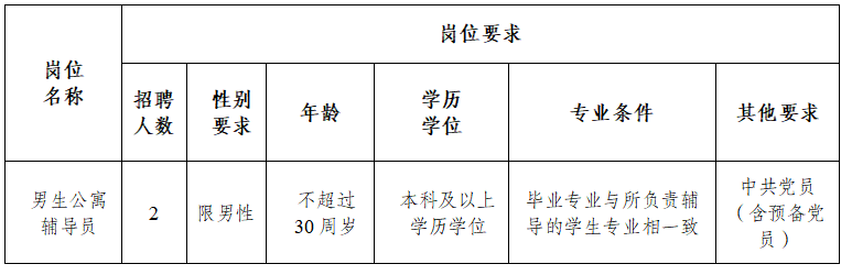 為進一步加強學校專職輔導員隊伍建設,經(jīng)學校研究,學校決定招聘2名編制外合同制專職輔導員,具體招聘有關事項公告如下: