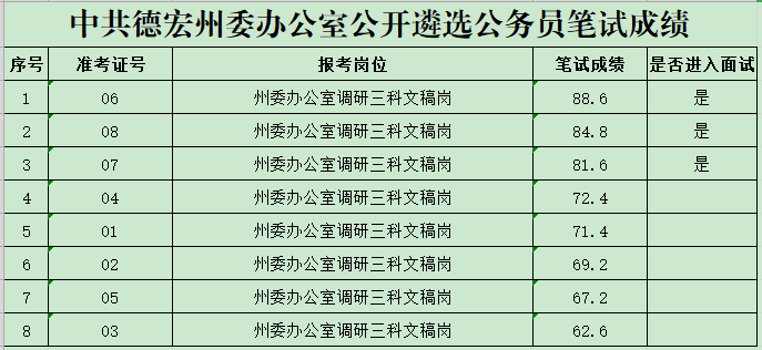 中共德宏州委辦公室公開遴選公務(wù)員筆試成績公布 根據(jù)《中共德宏州委辦公室公開遴選公務(wù)員公告》,現(xiàn)將筆試成績及面試人員公布如下: