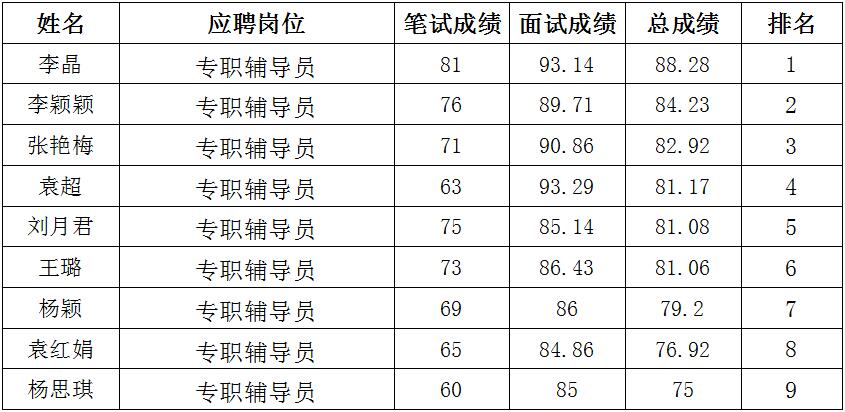 根據(jù)《昆明理工大學(xué)津橋?qū)W院2020年專職輔導(dǎo)員招聘公告》的要求,在統(tǒng)一考核的基礎(chǔ)上,按照筆試成績(jī)占40%,面試成績(jī)占60%的原則公布應(yīng)聘人員總成績(jī)?,F(xiàn)將成績(jī)公布如下: