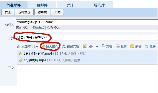 開始考試前,考生手持身份證于胸前置于鏡頭內、身份證信息和頭像清晰可見,報告自己的姓名及考號、報考專業(yè)。服裝方面要求穿著運動服,款式和顏色不限。視頻當中必須同時出現考生本人及秒表計時器(可用手機或秒表計時)。每段視頻長度控制在1.5分鐘以內,文件小于50M,文件格式為MP4,視頻分辨率不低于960*544,兩個視頻文件分別命名為:1分鐘跳繩、1分鐘仰臥起坐(先后順序不限)。視頻文件一律采用QQ郵箱超大附件模式發(fā)送,視頻錄制現場要求安靜且采光良好,測試內容的視頻必須完整,視頻不允許有剪輯或者修改等痕跡,要求一次錄制完成,考生可多次錄制,選取自己認為最好的一次上傳郵件,發(fā)送視頻郵件地址為:ynnuzlg@vip.126.com