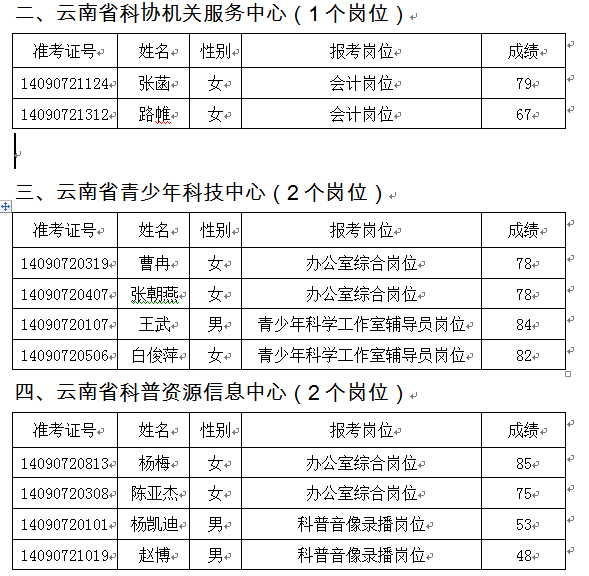 根據(jù)《云南省科學(xué)技術(shù)協(xié)會(huì)2014年事業(yè)單位公開招聘工作人員公告》,云南省科協(xié)面向社會(huì)公開招聘事業(yè)單位工作人員的筆試工作于2014年9月7日在昆明進(jìn)行。目前評(píng)卷工作已經(jīng)結(jié)束。根據(jù)公告規(guī)定,面試人選按照崗位筆試成績(jī)從高到低進(jìn)行排序,每個(gè)崗位按照擬招聘人數(shù)與進(jìn)入面試人數(shù)不低于1:2的比例進(jìn)入面試?,F(xiàn)將進(jìn)入面試人員名單公告如下(按筆試成績(jī)排序):