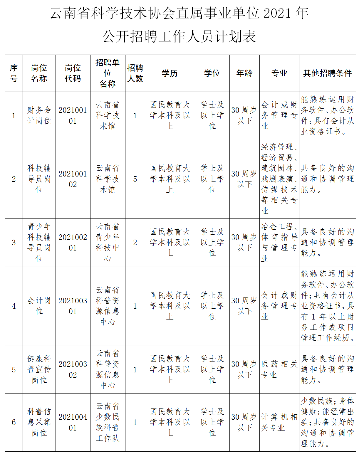 附件:云南省科學(xué)技術(shù)協(xié)會(huì)直屬事業(yè)單位2021年公開(kāi)招聘工作人員計(jì)劃表