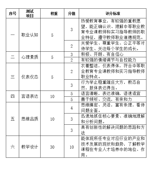 (一)測試方法采取結構化面試和情境模擬相結合的方法,通過抽題、備課、專業(yè)概述、試講(演示)、答辯等方式進行。