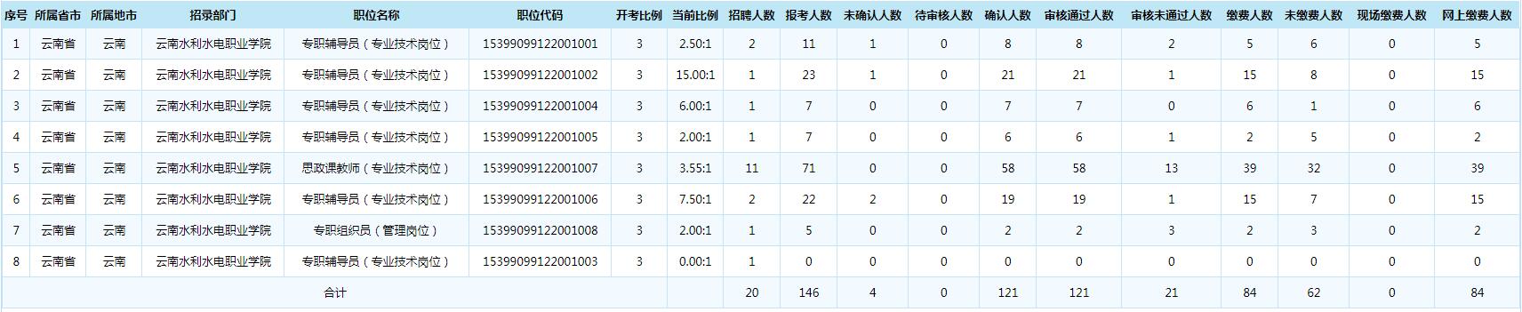 云南水利水電職業(yè)學院2021年公開招聘事業(yè)編制工作人員報名情況統(tǒng)計(截止4月25日16點)