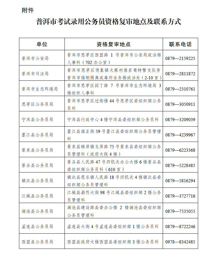 附件:普洱市考試錄用公務(wù)員資格復(fù)審地點及聯(lián)系方式