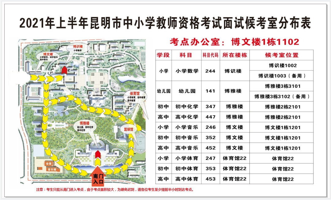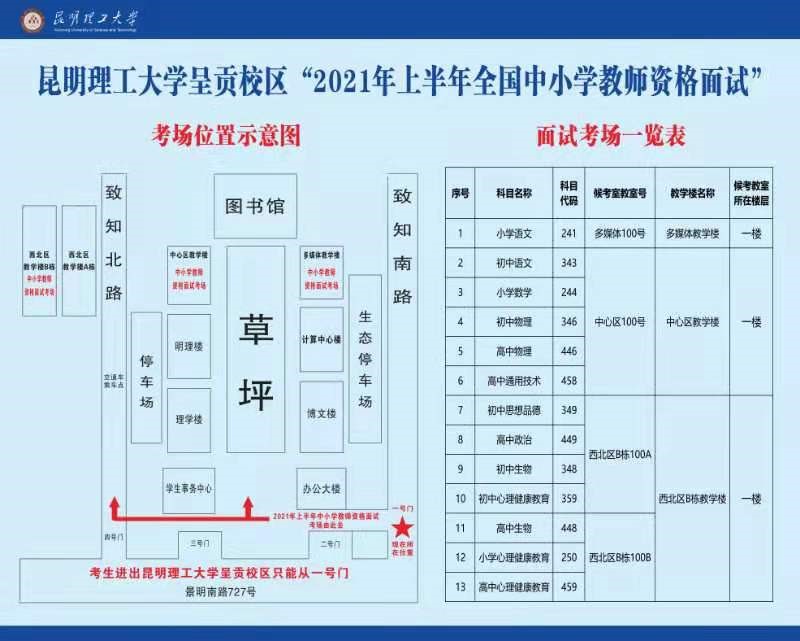 按照《云南省2021年上半年中小學(xué)教師資格考試(面試)公告》,為廣大考生能順利參加面試,現(xiàn)將考點(diǎn)示意圖、候考室分布等有關(guān)事項(xiàng)公告如下: