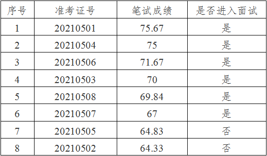 按照選調(diào)崗位筆試成績(jī)從高到低的順序,按1:3的比例確定面試人員。筆試成績(jī)及進(jìn)入面試人員名單如下: