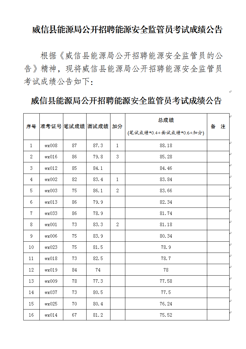 威信縣能源局公開招聘能源安全監(jiān)管員考試成績公告