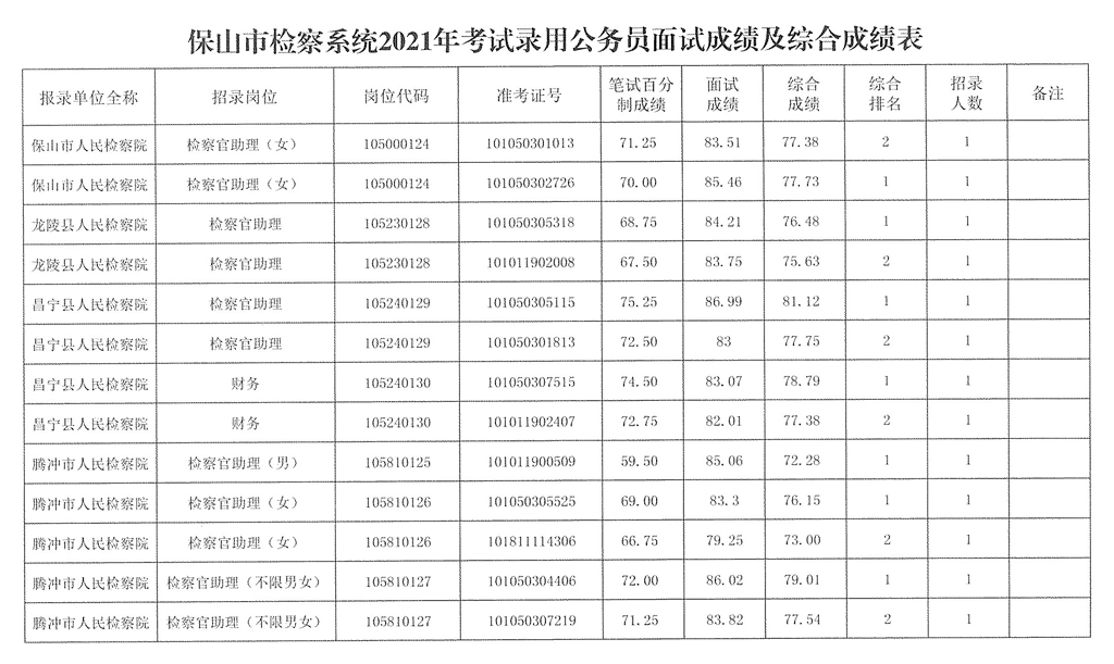 保山市檢察系統(tǒng)2021年考試錄用公務員面試工作已于2021年5月17日結束,現(xiàn)將面試成績及綜合成績予以公示。(成績按四舍五入保留兩位小數計算)