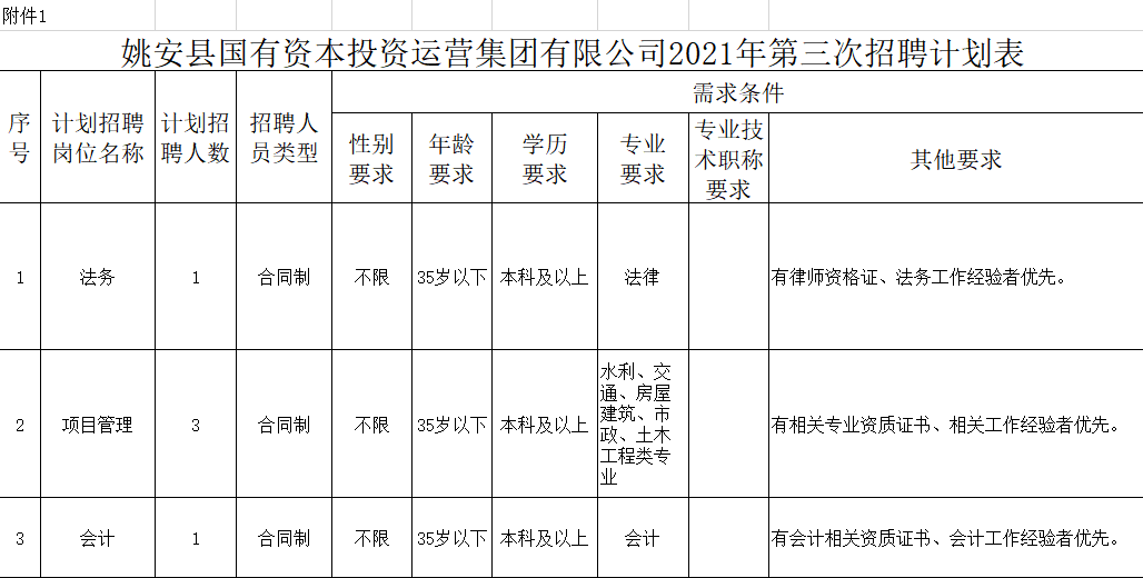 附件1:姚安縣國有資本投資運營有限公司2021年第三次招聘計劃表
