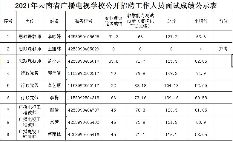 2021年云南省廣播電視學(xué)校公開(kāi)招聘工作人員面試成績(jī)公示表