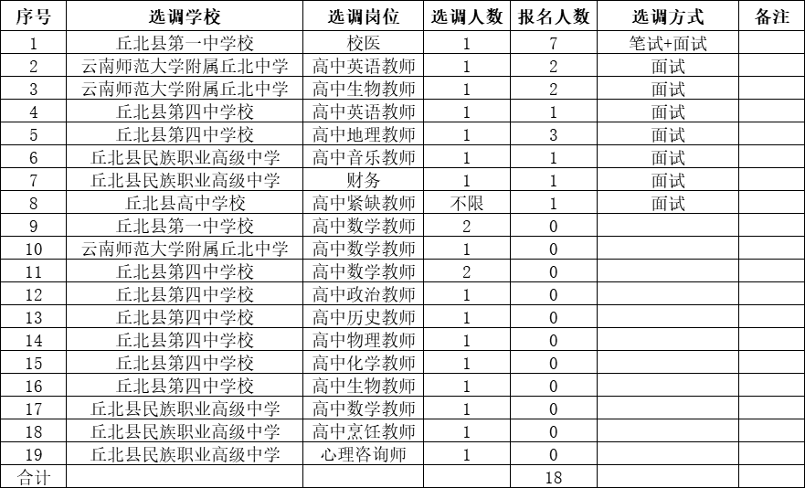 根據《丘北縣教體系統(tǒng)2021年公開選調高中在職在編人員方案》崗位設置,現(xiàn)將報名情況公示如下,請應聘人員按時參加筆試、面試: