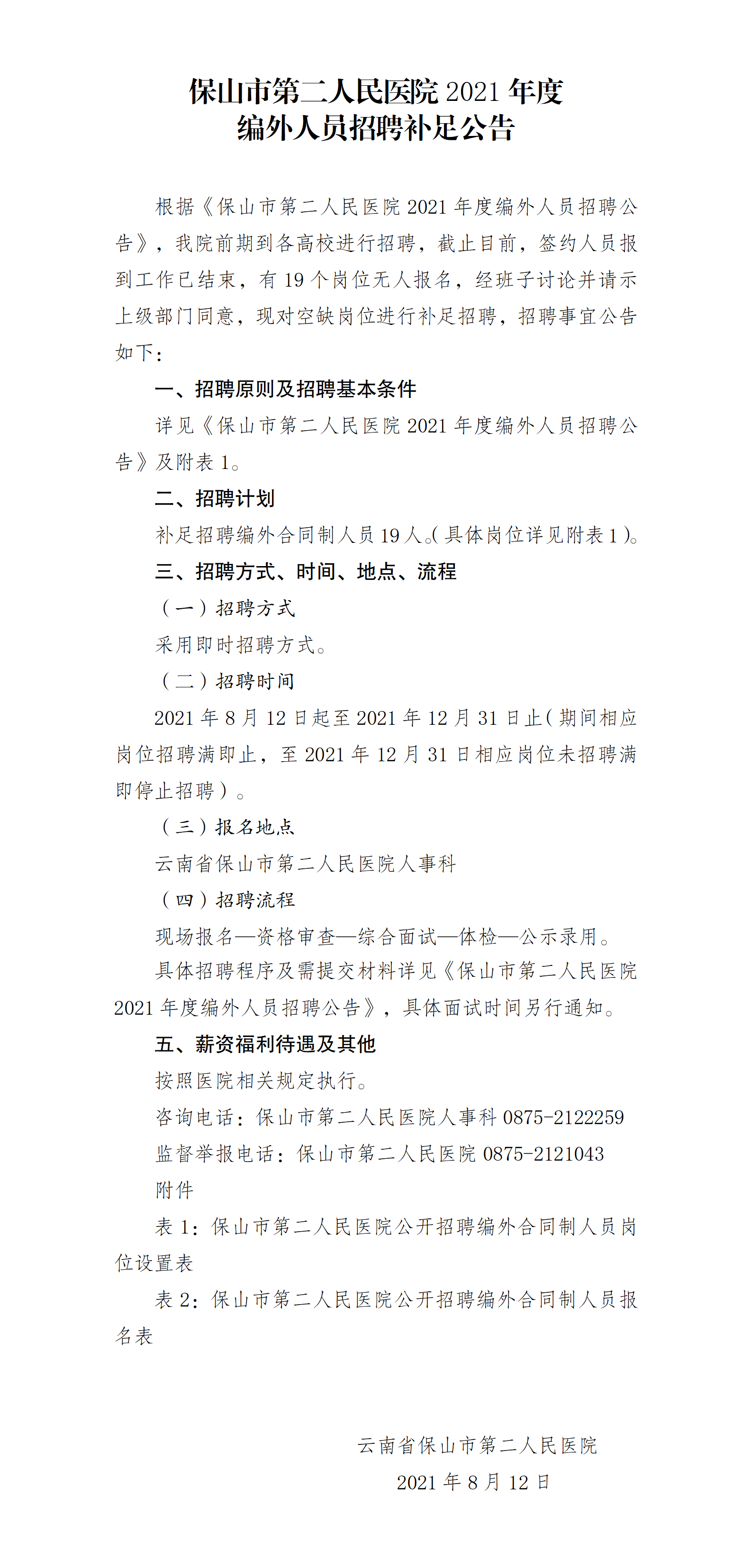 保山市第二人民醫(yī)院2021年度編外人員招聘補(bǔ)足公告