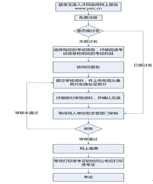 網(wǎng)絡(luò)報名的大致流程為:登錄玉溪人才網(wǎng)→網(wǎng)上報名入口→注冊→查看招聘崗位→按崗位報名并填寫報名資料→等待審核→審核通過→網(wǎng)上交費(注意查看交費狀態(tài),確認(rèn)交費成功)→打印筆試準(zhǔn)考證(打印時間在筆試公告內(nèi)另行通知)→參加筆試。