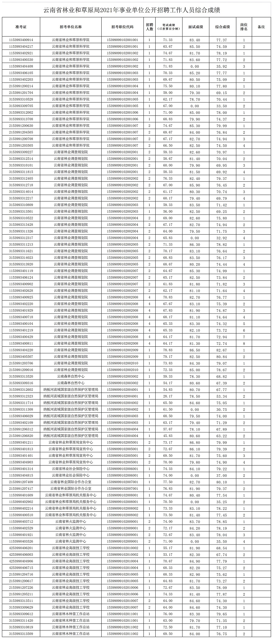現(xiàn)將2021年云南省林業(yè)和草原局事業(yè)單位公開招聘工作人員綜合成績和崗位排名公告如下: