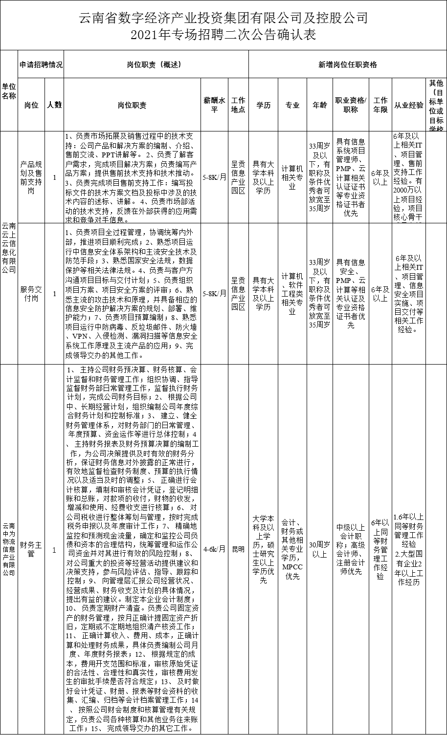 附件: 附件1:云南省數(shù)字經(jīng)濟產(chǎn)業(yè)投資集團有限公司及控股公司2021年專場招聘崗位需求表(二次公告表)