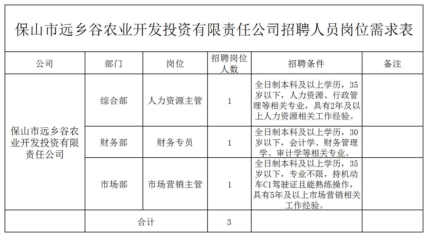 保山市遠(yuǎn)鄉(xiāng)谷農(nóng)業(yè)開(kāi)發(fā)投資有限責(zé)任公司招聘公告