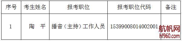 寧洱縣融媒體中心2021年特殊招聘播音(主持)工作人員招聘工作,經(jīng)發(fā)布公告、報(bào)名、資格復(fù)審、面試、考察、體檢程序,確定陶平為擬聘用人員。現(xiàn)公示如下,公示時(shí)間從2021年9月6日起至9月14日止(共7個(gè)工作日),若信息有誤或?qū)M聘用人員有異議的,請(qǐng)與中共寧洱縣委組織部干部監(jiān)督科聯(lián)系。