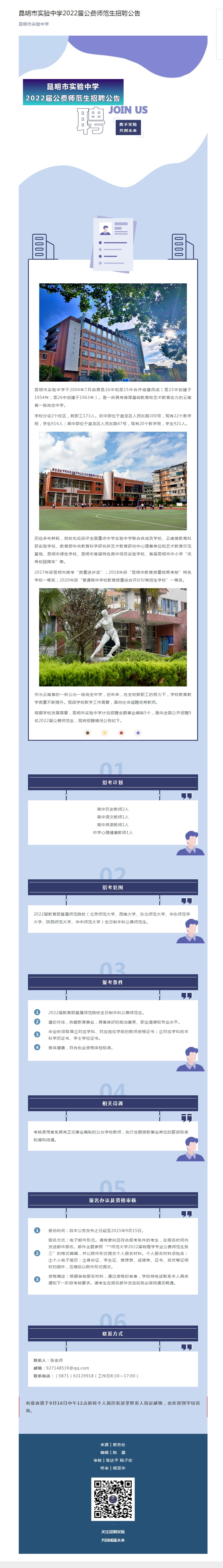 昆明市實驗中學招聘5人 報名時間:截止2019年9月15日 報名方式:郵箱報名 昆明市實驗中學2022屆公費師范生招聘公告
