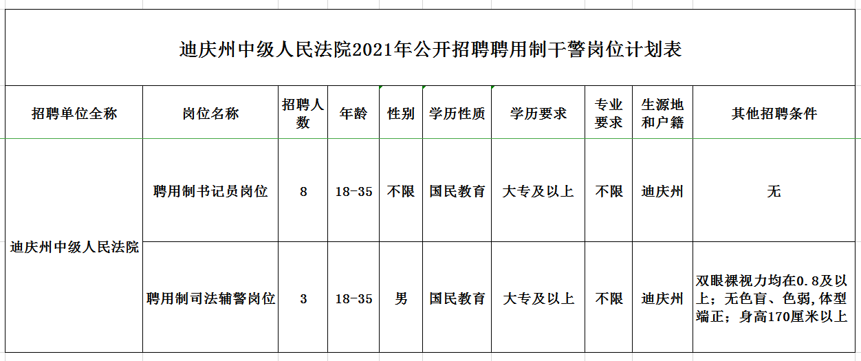 迪慶中院計劃招聘8名聘用制書記員、3名聘用制司法輔警。招聘計劃詳見《迪慶州中級人民法院2021年公開招聘聘用制干警崗位表》(以下簡稱《崗位表》)。