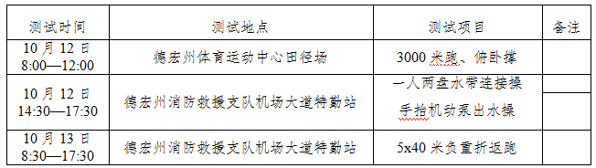 (一)報到時間:參加專業(yè)技能測試人員于10月11日15時30分前到德宏州消防救援支隊(duì)機(jī)場大道特勤站報到(芒市機(jī)場向芒市城區(qū)方向500米處中石化加油站旁),(聯(lián)系人:楊德明 18869203119;趙坤 18988225040)。