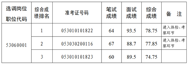 選調(diào)崗位云南省人大常委會(huì)機(jī)關(guān)2021年公開(kāi)遴選公務(wù)員面試工作于2021年10月11日結(jié)束。根據(jù)《2021年下半年云南省省級(jí)機(jī)關(guān)統(tǒng)一公開(kāi)遴選公務(wù)員公告》相關(guān)要求,現(xiàn)將參加面試人員綜合成績(jī)以及體檢和考察相關(guān)事宜通知如下: