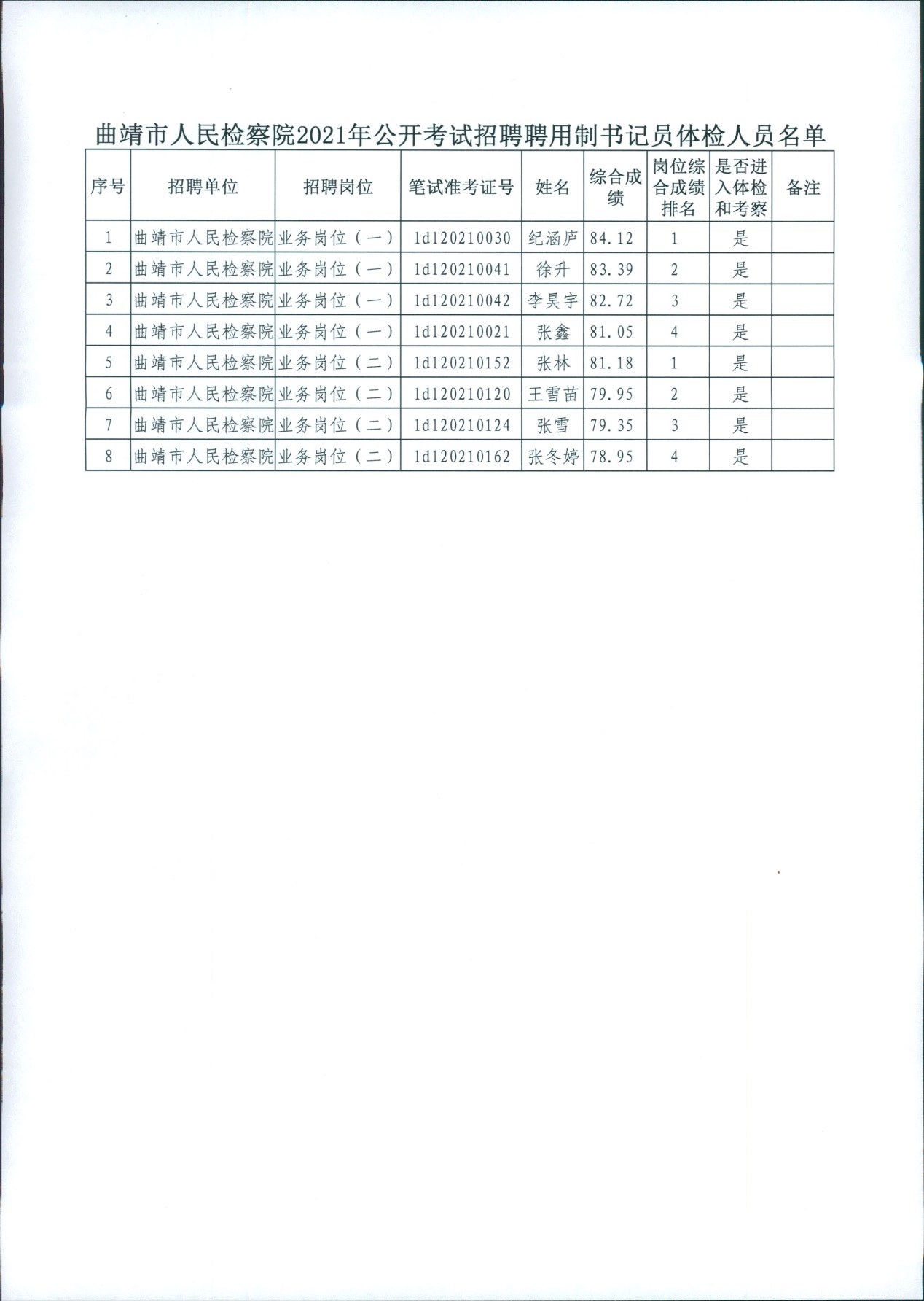 曲靖市人民檢察院2021年招聘聘用制書(shū)記員體檢相關(guān)事宜公告