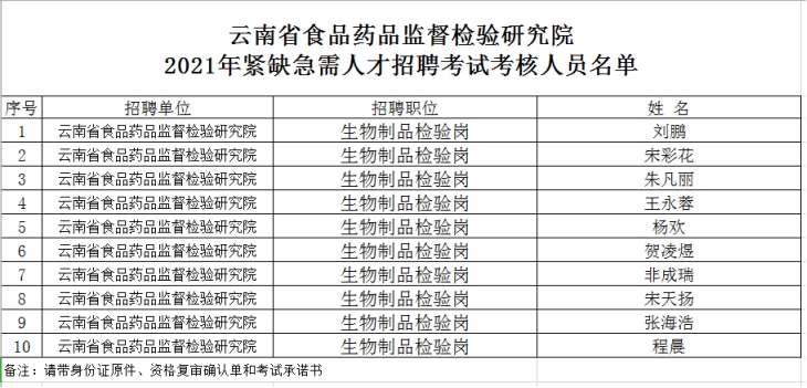 附件:云南省食品藥品監(jiān)督檢驗(yàn)研究院2021年緊缺急需人才招聘考試考核人員名單