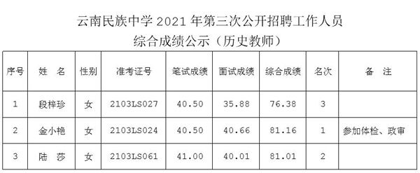 2021年云南民族中學第三次招聘工作人員綜合成績公示(歷史)