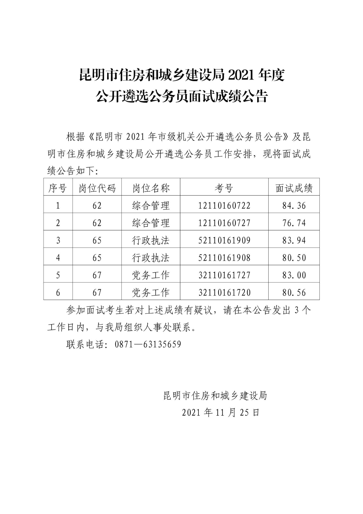 2021年昆明市住房和城鄉(xiāng)建設(shè)局遴選公務(wù)員面試成績公告