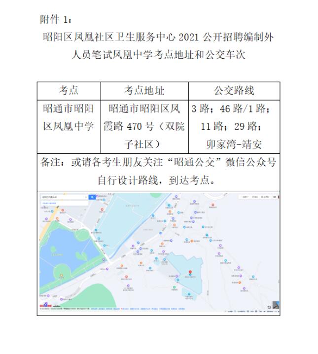 附件:1.昭陽(yáng)區(qū)鳳凰社區(qū)衛(wèi)生服務(wù)中心2021公開(kāi)招聘編制外人員筆試?guó)P凰中學(xué)考點(diǎn)地址和公交車次表