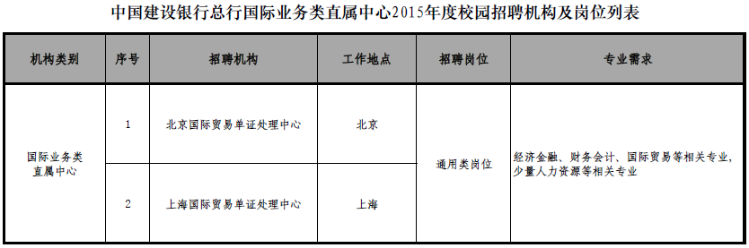(具體招聘機(jī)構(gòu)、崗位及專業(yè)需求詳見附件:中國建設(shè)銀行總行國際業(yè)務(wù)類直屬中心2015年度校園招聘機(jī)構(gòu)及崗位列表)