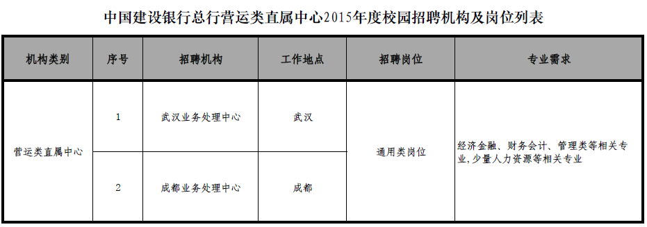 (具體招聘機(jī)構(gòu)、崗位及專業(yè)需求詳見附件:中國建設(shè)銀行總行營運(yùn)類直屬中心2015年度校園招聘機(jī)構(gòu)及崗位列表)