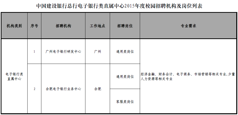 (具體招聘機構、崗位及專業(yè)需求詳見附件:中國建設銀行總行電子銀行類直屬中心2015年度校園招聘機構及崗位列表)