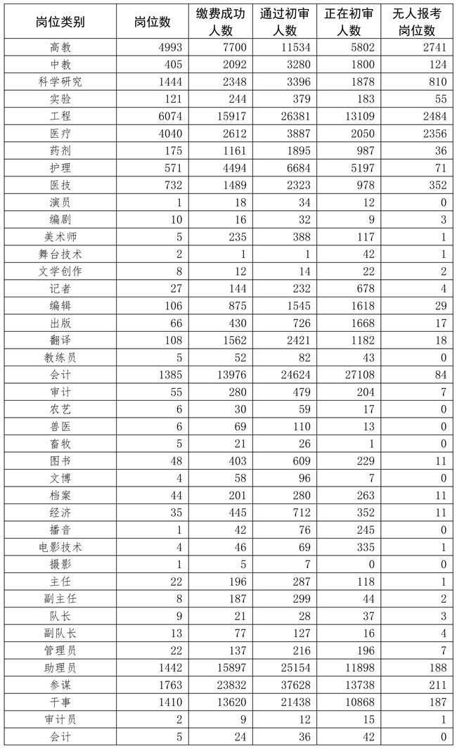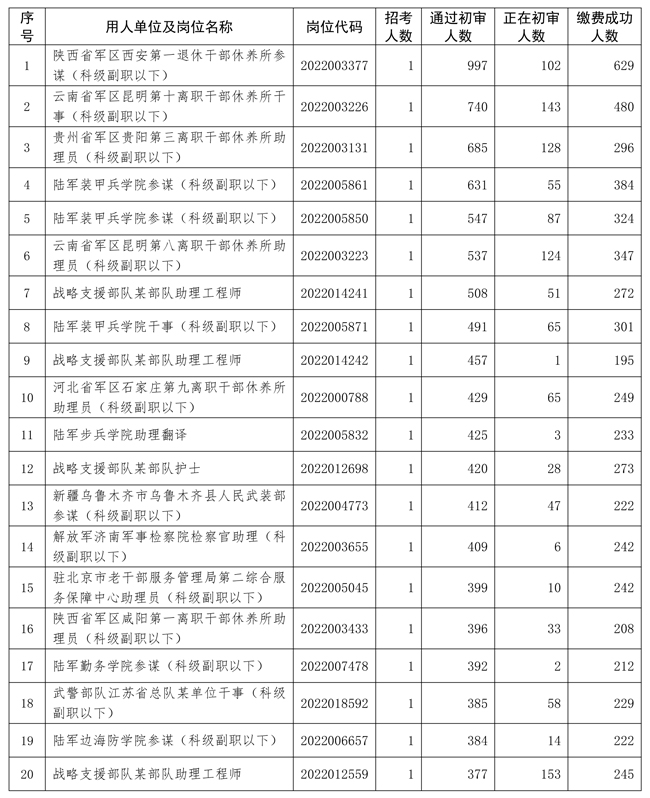 2022年全軍面向社會(huì)公開招考文職人員(不含先面試后筆試崗位)網(wǎng)上報(bào)名火熱進(jìn)行中。截至12月8日17時(shí),提交報(bào)名資格條件初審共546363人次,通過網(wǎng)上報(bào)名資格條件初審的報(bào)考人員182464人,繳費(fèi)成功的報(bào)考人員114104名,用人單位正在進(jìn)行報(bào)名資格條件初審的報(bào)考人員105424人。有人報(bào)考的崗位15656個(gè)、占61.3%,平均報(bào)招考比為11.7:1,最高報(bào)招考比為997:1。此次招考網(wǎng)上報(bào)名時(shí)間還剩最后1天,請廣大報(bào)考人員抓緊時(shí)間申請報(bào)名資格條件初審,密切關(guān)注初審結(jié)果。因各城市考試席位有限,通過初審的報(bào)考人員請及時(shí)繳費(fèi)和選擇考試城市。相關(guān)招考崗位報(bào)考情況如下: