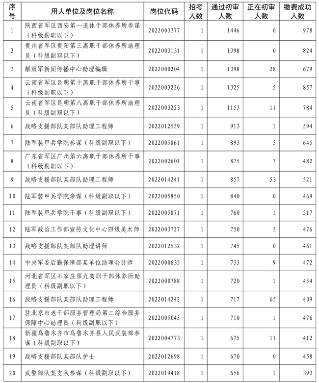 2022年全軍面向社會(huì)公開(kāi)招考文職人員(不含先面試后筆試崗位)網(wǎng)上報(bào)名資格條件初審正在進(jìn)行中。截至12月10日17時(shí),提交報(bào)名資格條件初審共975324人次,通過(guò)初審的報(bào)考人員447958人,繳費(fèi)成功的報(bào)考人員320623名,用人單位正在進(jìn)行初審的報(bào)考人員17063人。有人報(bào)考的崗位19731個(gè)、占77.3%,平均報(bào)招考比為22.7:1,最高報(bào)招考比為1446:1。12月11日18:00前,用人單位繼續(xù)進(jìn)行報(bào)名資格條件初審,因證明材料不全未通過(guò)初審的報(bào)考人員可補(bǔ)充材料繼續(xù)報(bào)考該崗位。因各城市考試席位有限,通過(guò)初審的報(bào)考人員請(qǐng)及時(shí)繳費(fèi)和選擇考試城市。